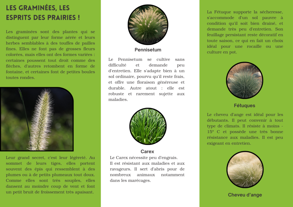 On a cherché un document qui pourrait convenir à notre sujet. On a choisi de faire un flyer pour montrer l’intérêt des graminées et en présenter quelques-uns aux clients de la serre.